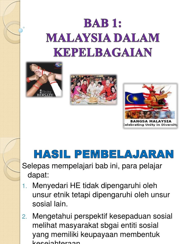 Namun, dengan kesedaran untukmembina sebuah negara yang aman dan makmur, perpaduan dapat di kukuhkan dengansemangat kekitaan antara etnik.1.5.perpaduan. Memantau dari sudut makro dan mikro keadaan. Konsep kesepaduan adalah lebih realistik dalam konteks malaysia. Dalam lembaga sosial tersebut nantinya juga terdapat aturan yang disepakati bersama sehingga ia dapat berjalan sesuai dengan keinginan bersama. Kriteria masyarakat majmuk di malaysia pada awal kemerdekaan mencakupi perkara berikut iaitu _____.