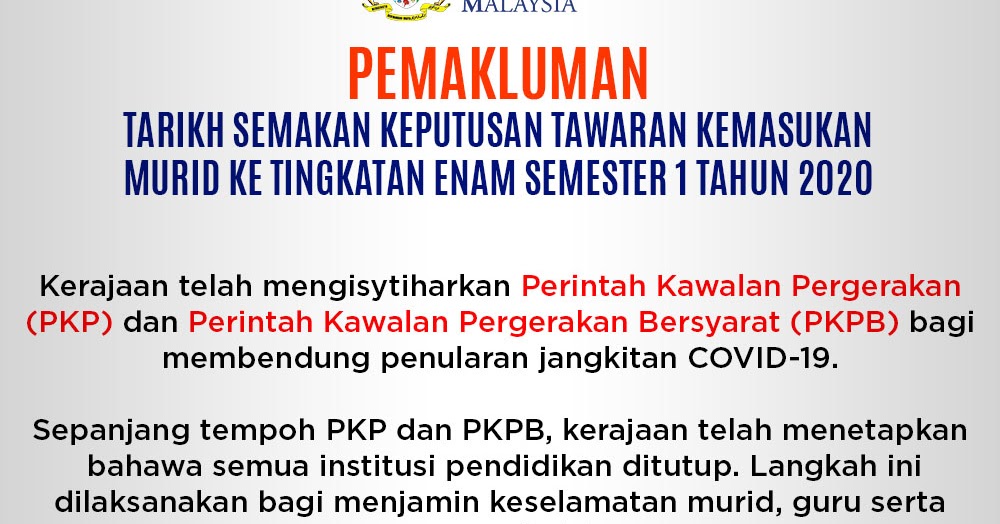 Semakan Ke Tingkatan 6 : Untuk makluman, tarikh sebenar untuk semakan berkenaan juga akan diumumkan di portal kpm.. Semakan keputusan tawaran tingkatan 6 2020 online. Syarat kemasukan ke tingkatan enam. Berikut adalah syarat umum pemilihan pelajar ke tingkatan 6: Semakan tingkatan 6 2019 online, semakan keputusan tawaran tingkatan 6 2019 iaitu semakan tawaran form 6 kemasukan ke tingkatan 6 secara perhatian buat lepasan spm yang bercadang untuk memasuki tingkatan 6 (enam) atau form 6. Semakan keputusan tingkatan 6 tahun 2020.